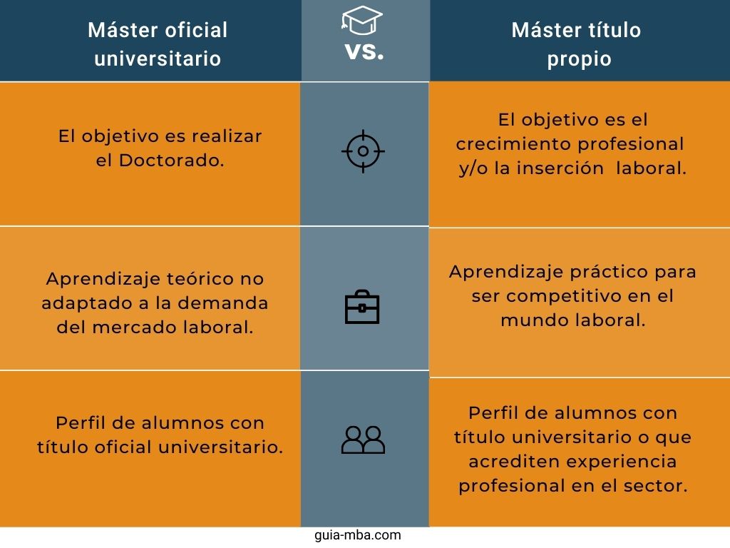 | Factor | Máster Oficial Presencial | Máster Oficial Online | Título Propio |